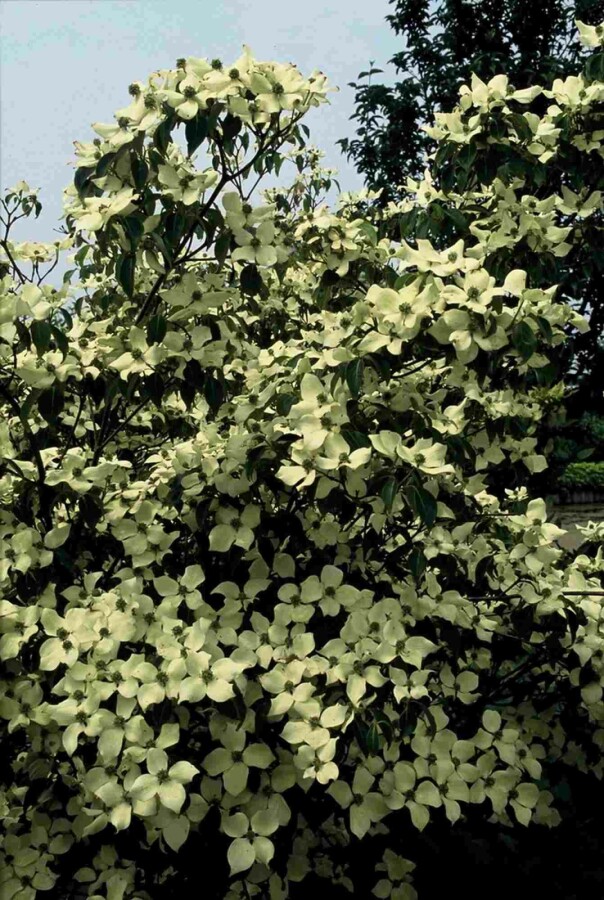 Die Blütezeit dieser Pflanze erstreckt sich über die Monate Juni und Juli. Cornus kousa 'China Girl' zeigt in dieser Zeit ihre gelben und weißen Blüten.