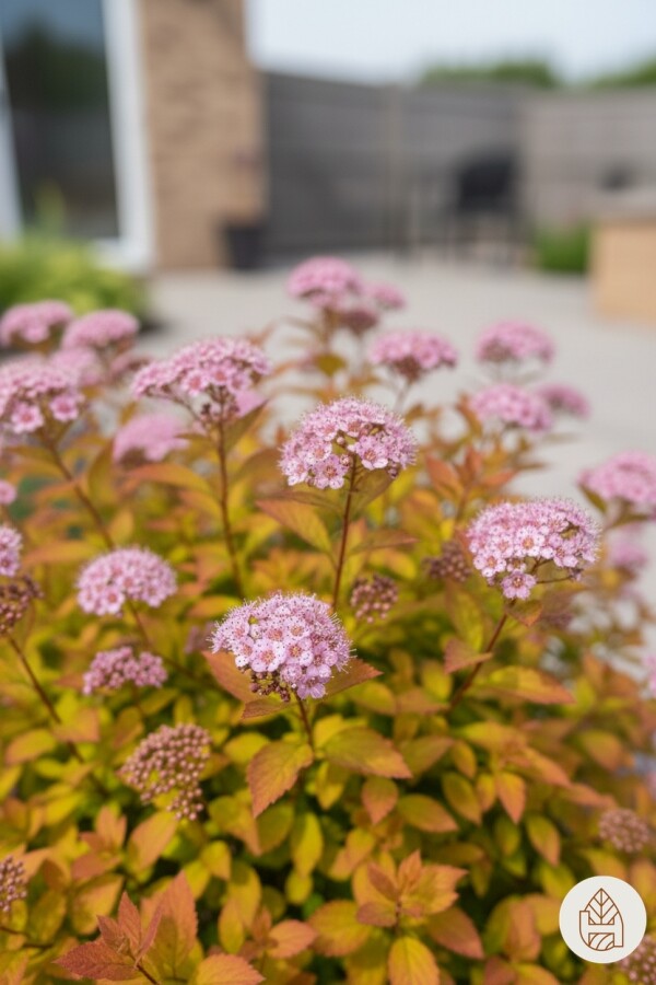 Welche Farbe haben die Blüten des Spiraea japonica 'Goldflame' Strauch?