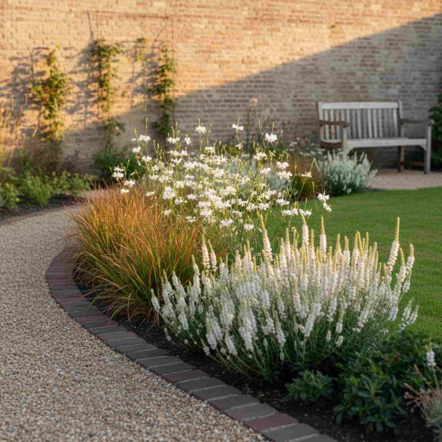 • Warme Farbspiele mit oranger Carex und weißen Blüten von Gaura und Liatris