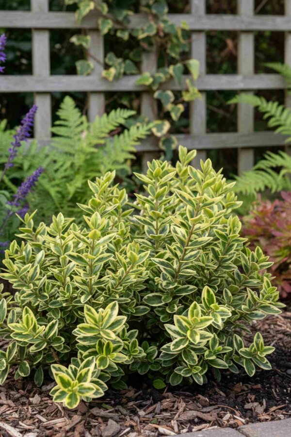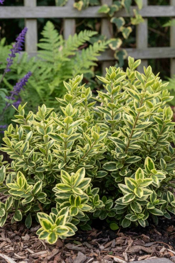 • Hebe 'Pinocchio' ist eine kompakte, kugelförmige Gartenpflanze, die auch im Winter ihr grünes Laub behält.